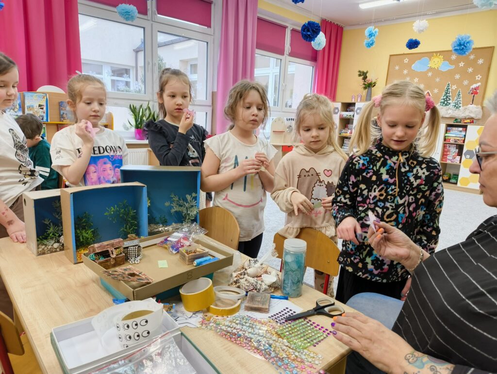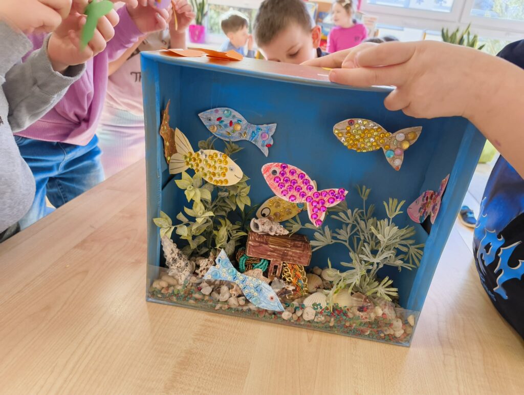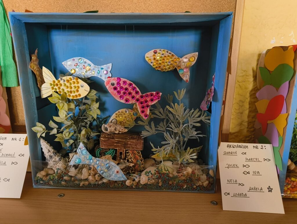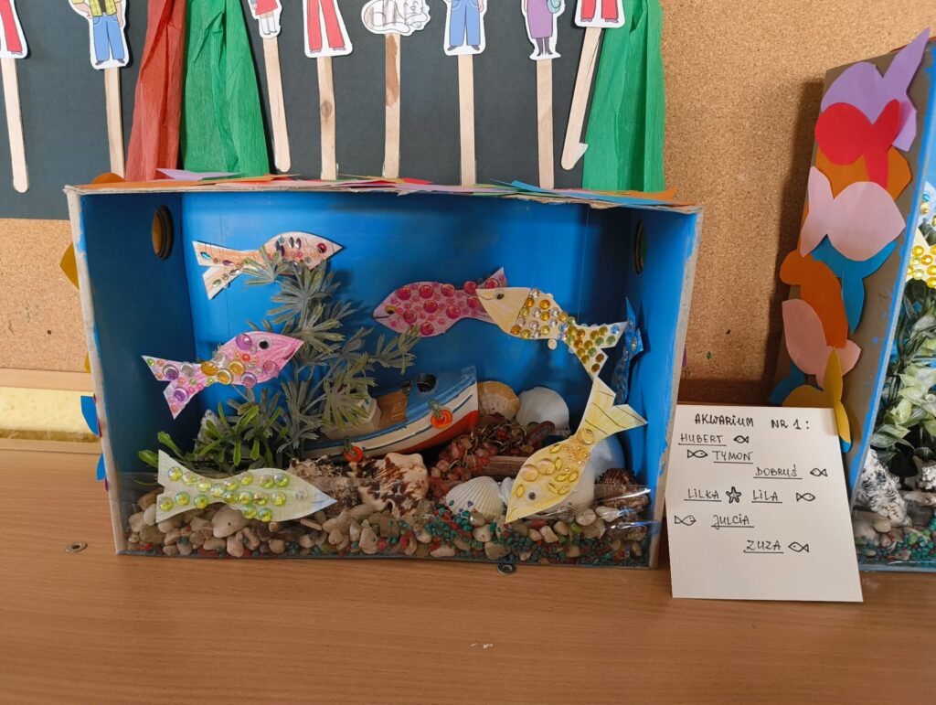 SMERFY pracowały dzielnie przy produkcji różnych gatunków rybek, samodzielnie planowały i projektowały rozkład akcesoriów w każdym akwarium, „sadziły” rośliny, układały muszle i instalowały skrzynie skarbów. Było to efektowne i bardzo przyjemne podsumowanie tematyki o zwierzętach hodowanych w domu.