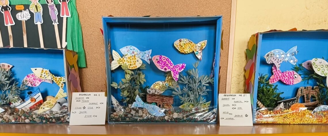 Trzy dni. Tyle trwało tworzenie akwariowych makiet. SMERFY pracowały dzielnie przy produkcji różnych gatunków rybek, samodzielnie planowały i projektowały rozkład akcesoriów w każdym akwarium, „sadziły” rośliny, układały muszle i instalowały skrzynie skarbów. Było to efektowne i bardzo przyjemne podsumowanie tematyki o zwierzętach hodowanych w domu.