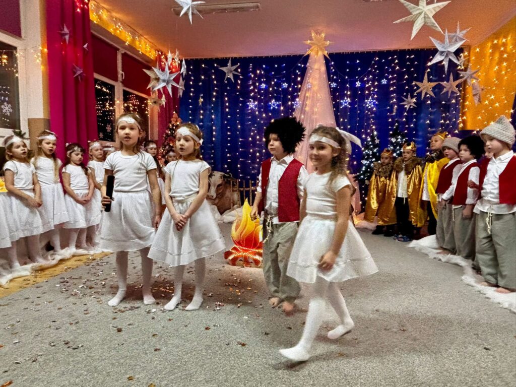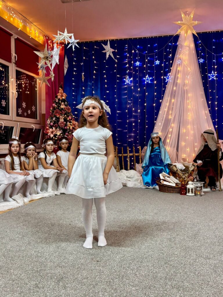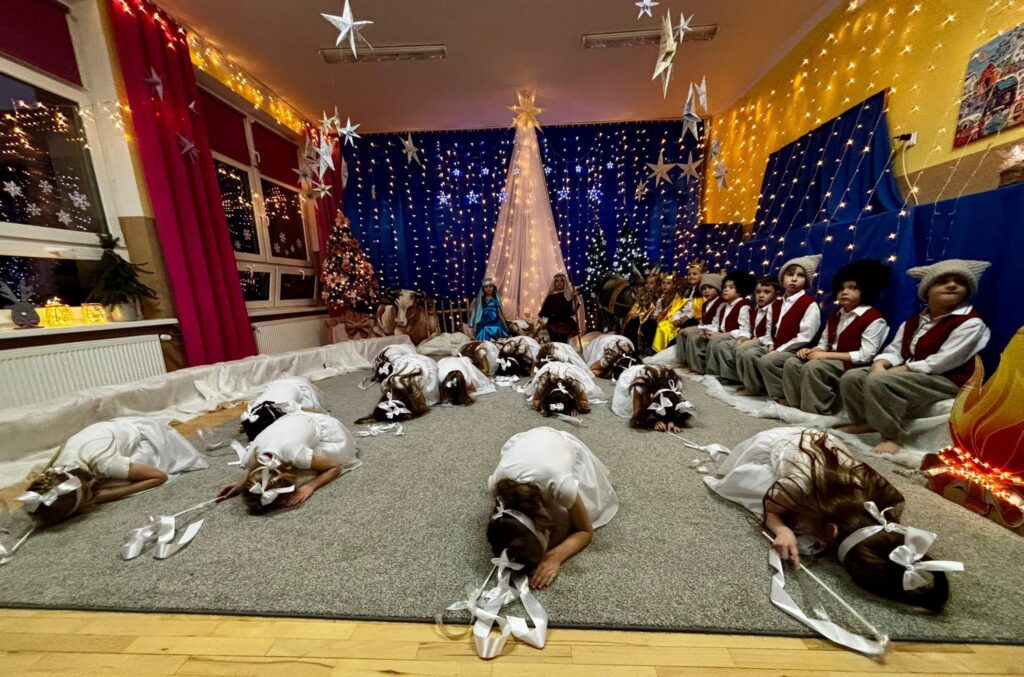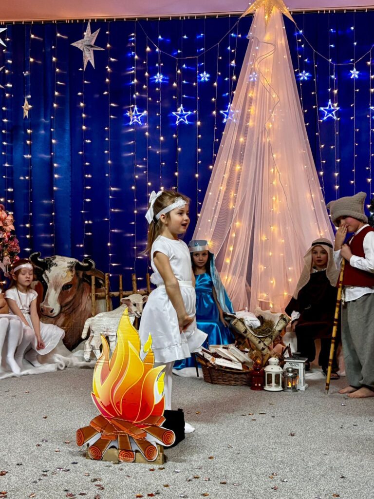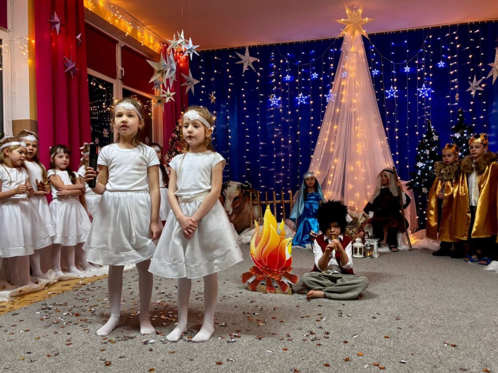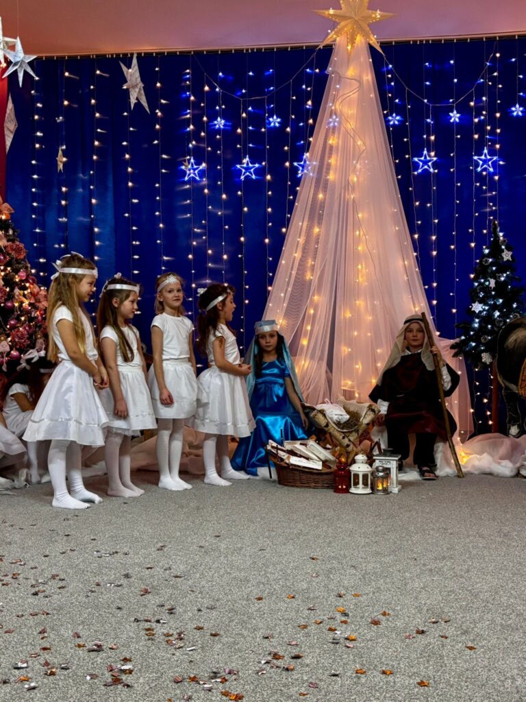 Przedstawienie jasełkowe w wykonaniu SMERFÓW wprowadziło zaproszonych gości – rodziców w świąteczny i magiczny czas! Świąteczny nastrój podkreślały niecodzienne stroje dzieci i piękna dekoracja sceny. Mali aktorzy z wielkim przejęciem wygłaszali swoje role i z radością śpiewali kolędy i pastorałki.