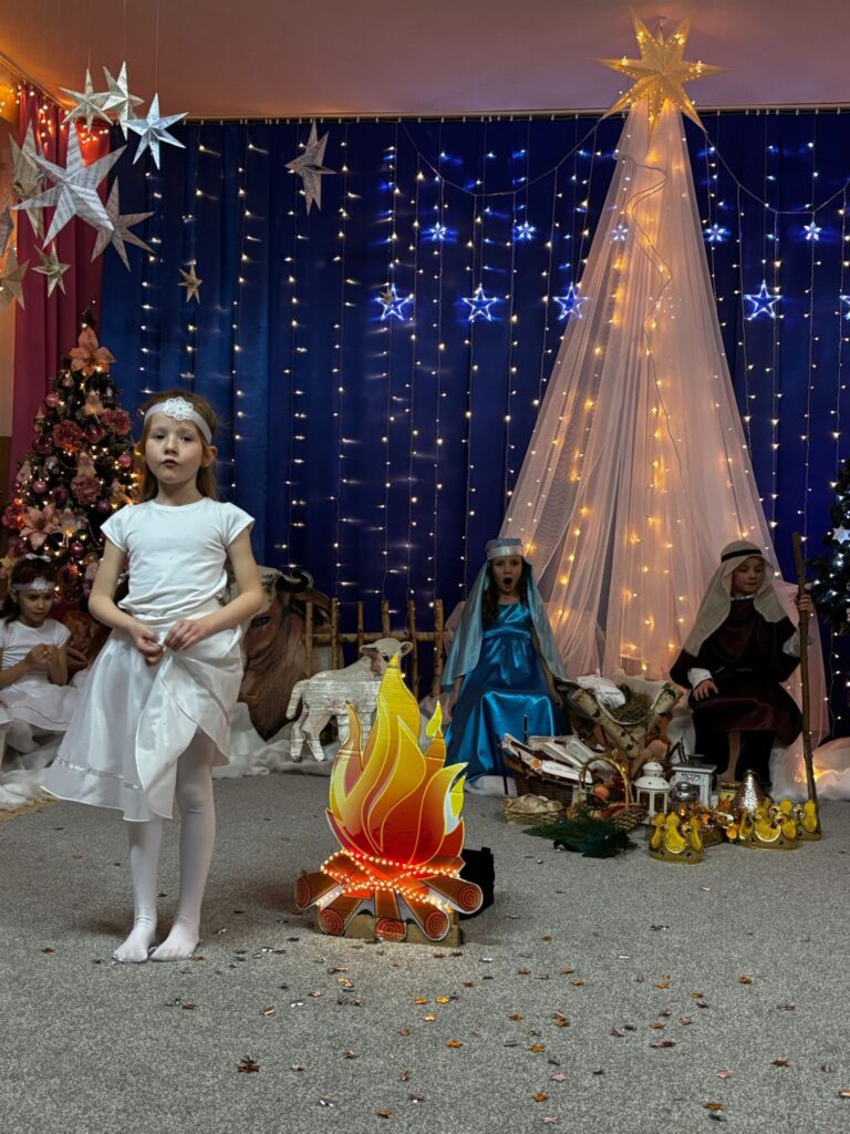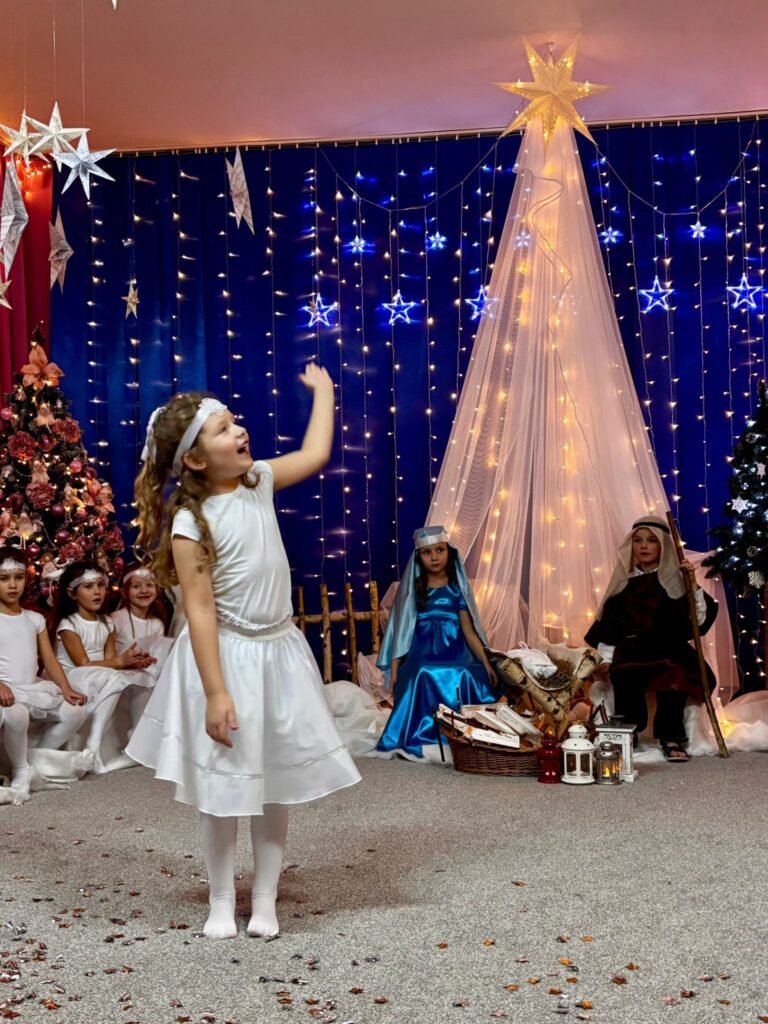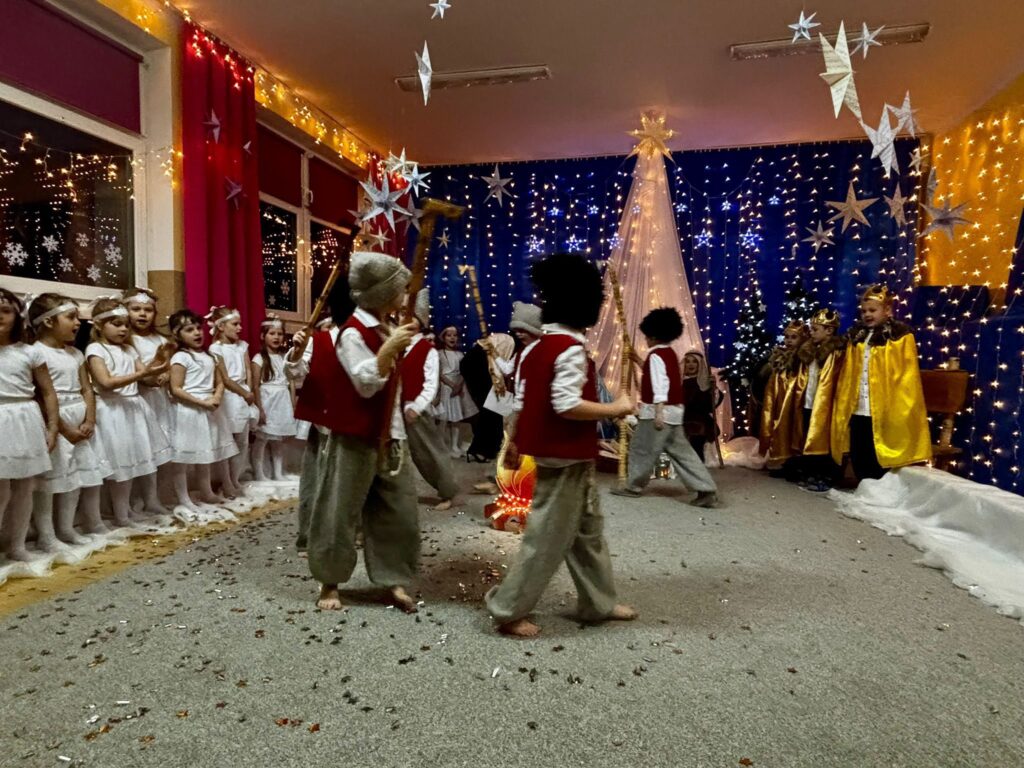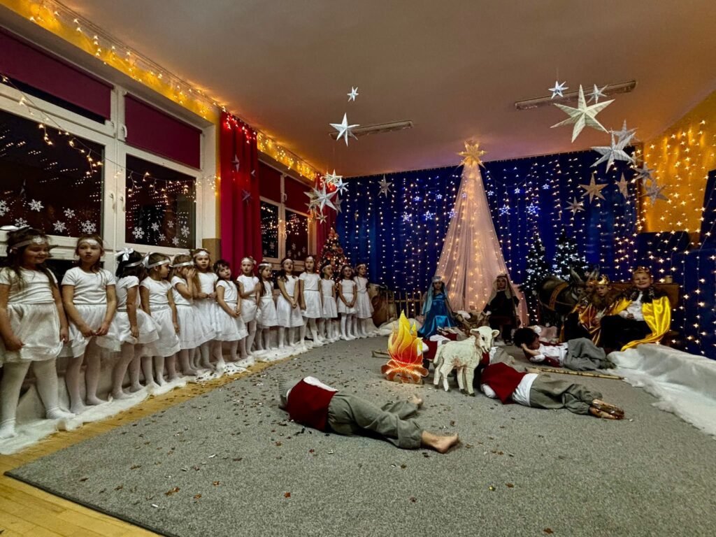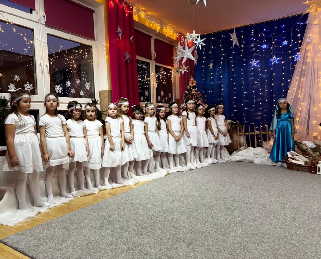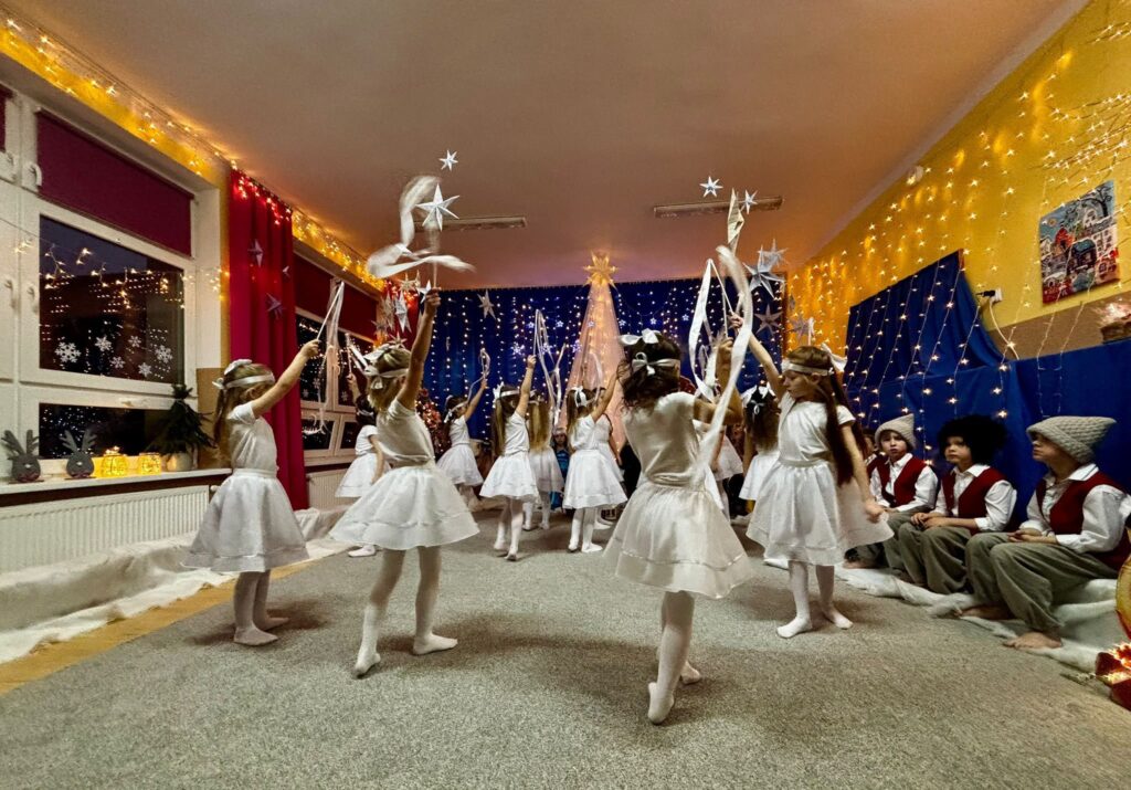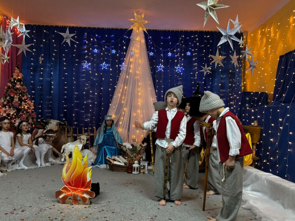 Przedstawienie jasełkowe w wykonaniu SMERFÓW wprowadziło zaproszonych gości – rodziców w świąteczny i magiczny czas! Świąteczny nastrój podkreślały niecodzienne stroje dzieci i piękna dekoracja sceny. Mali aktorzy z wielkim przejęciem wygłaszali swoje role i z radością śpiewali kolędy i pastorałki.