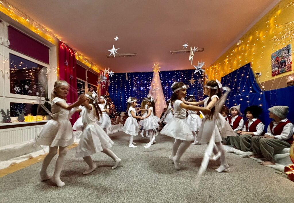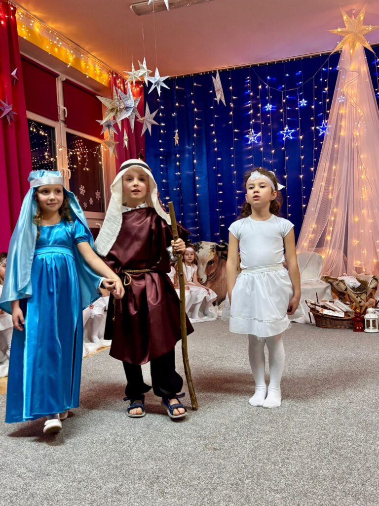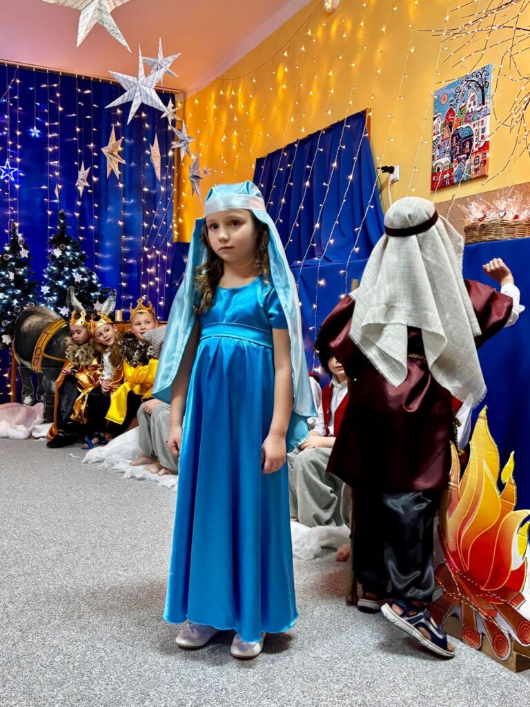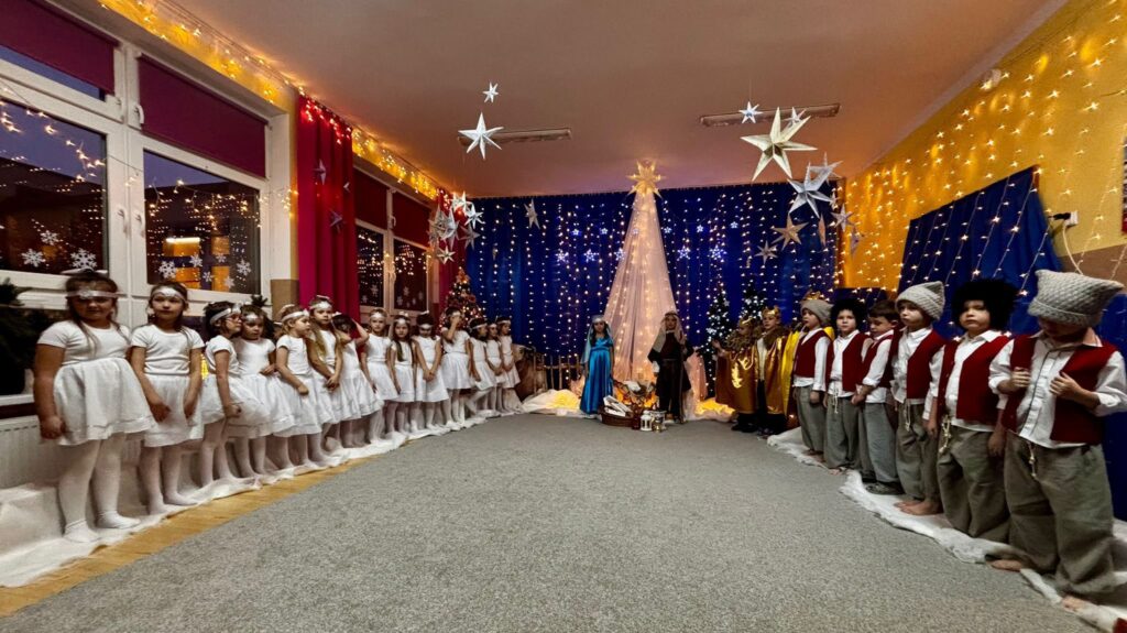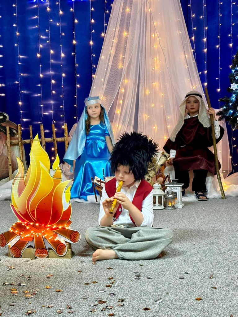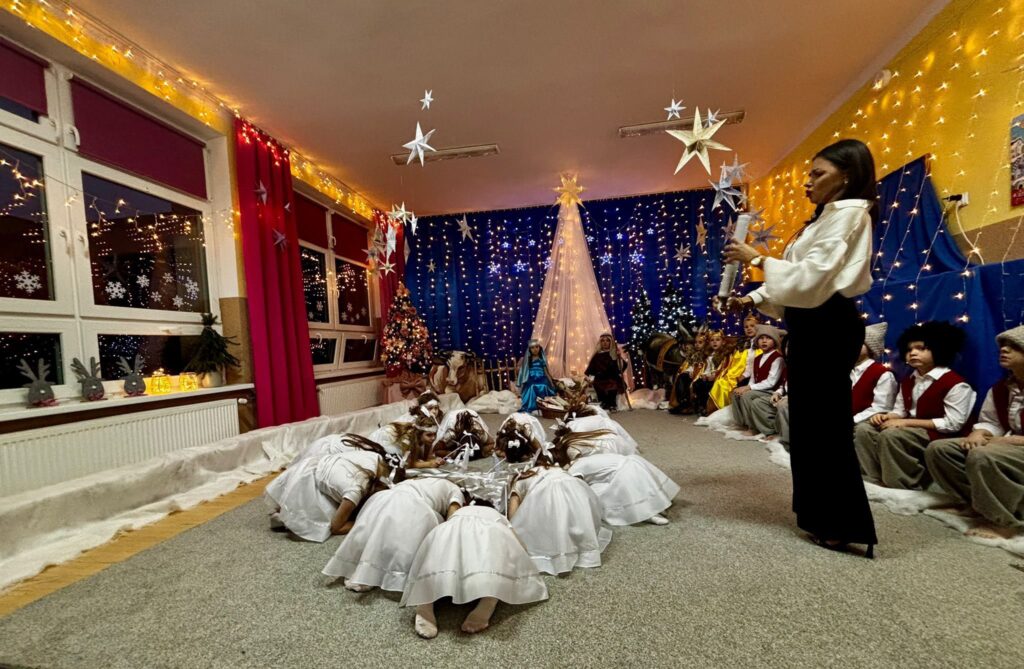 Przedstawienie jasełkowe w wykonaniu SMERFÓW wprowadziło zaproszonych gości – rodziców w świąteczny i magiczny czas! Świąteczny nastrój podkreślały niecodzienne stroje dzieci i piękna dekoracja sceny. Mali aktorzy z wielkim przejęciem wygłaszali swoje role i z radością śpiewali kolędy i pastorałki.