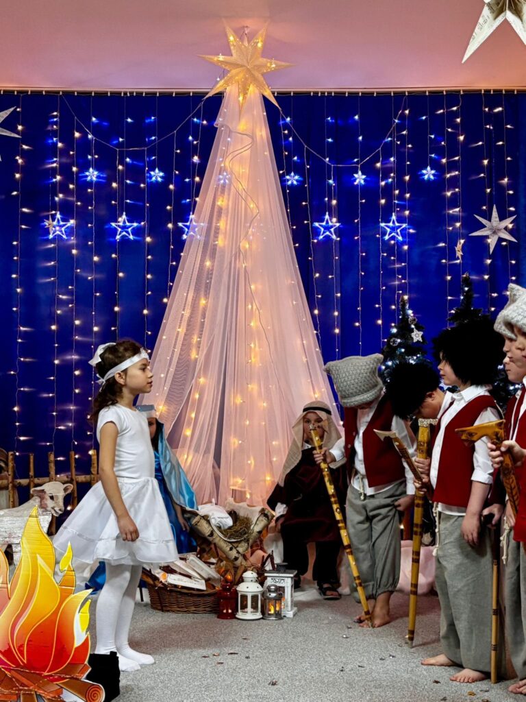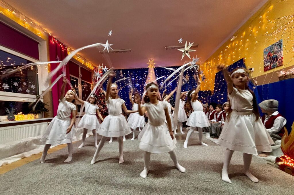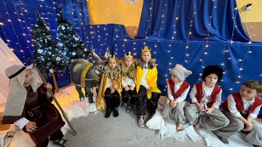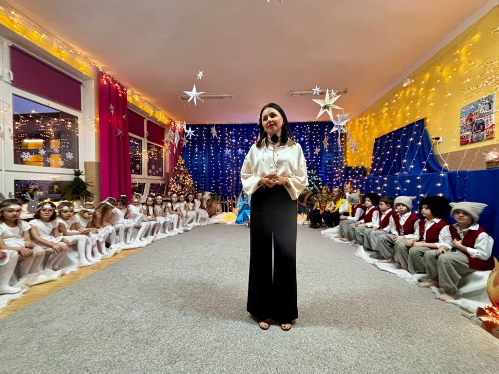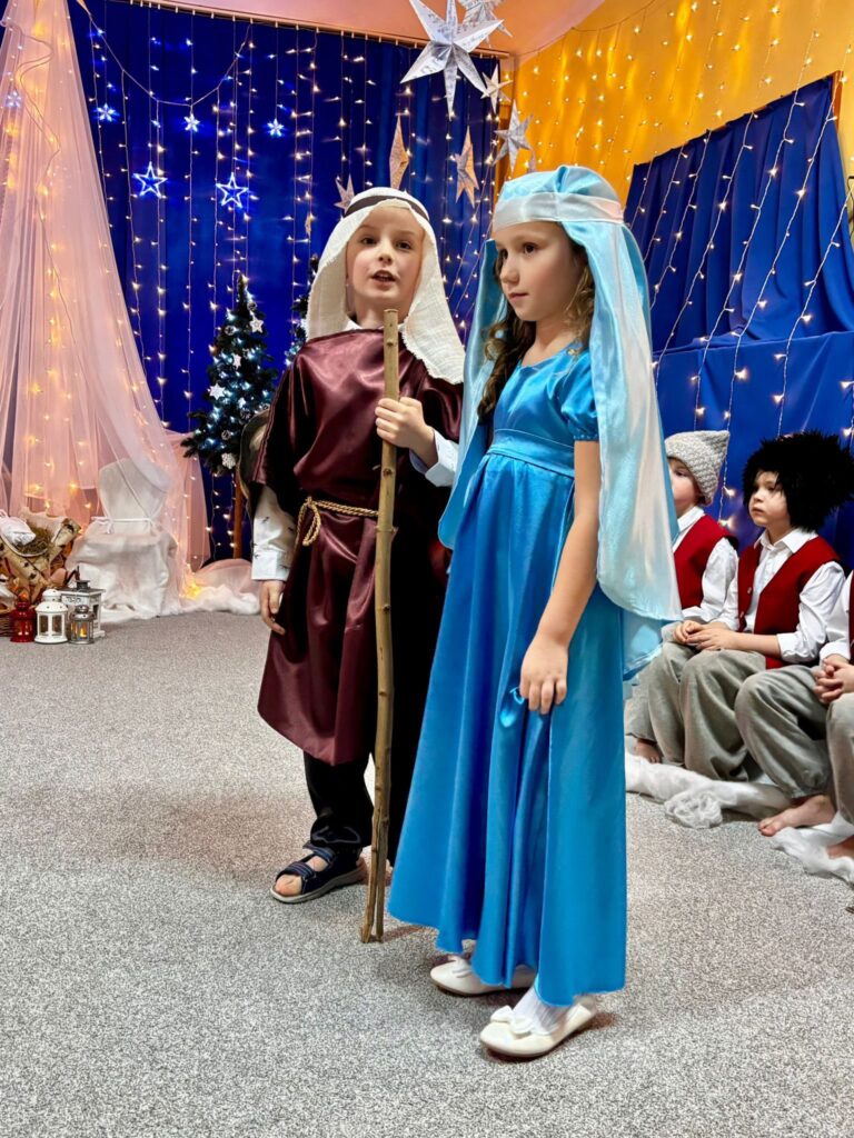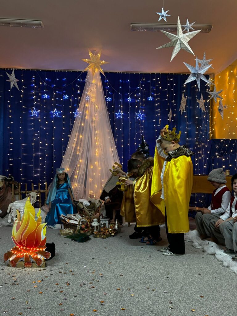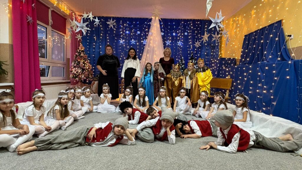 Przedstawienie jasełkowe w wykonaniu SMERFÓW wprowadziło zaproszonych gości – rodziców w świąteczny i magiczny czas! Świąteczny nastrój podkreślały niecodzienne stroje dzieci i piękna dekoracja sceny. Mali aktorzy z wielkim przejęciem wygłaszali swoje role i z radością śpiewali kolędy i pastorałki.