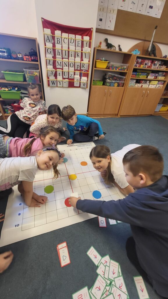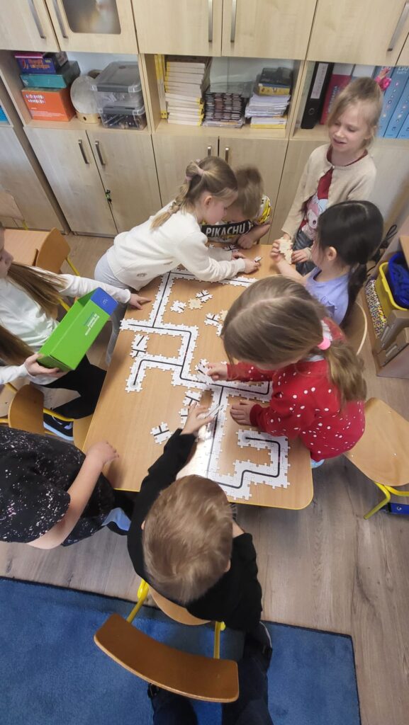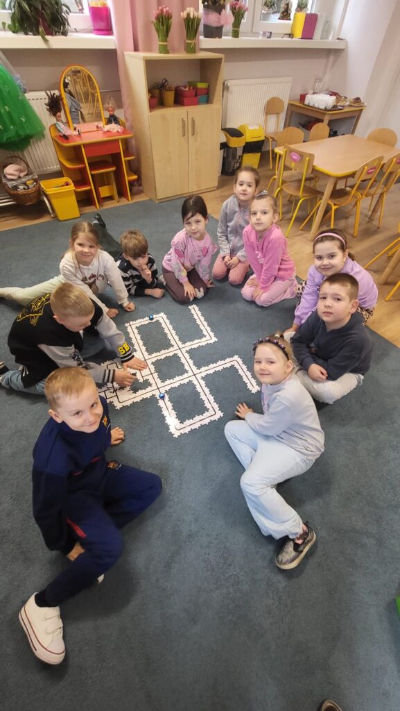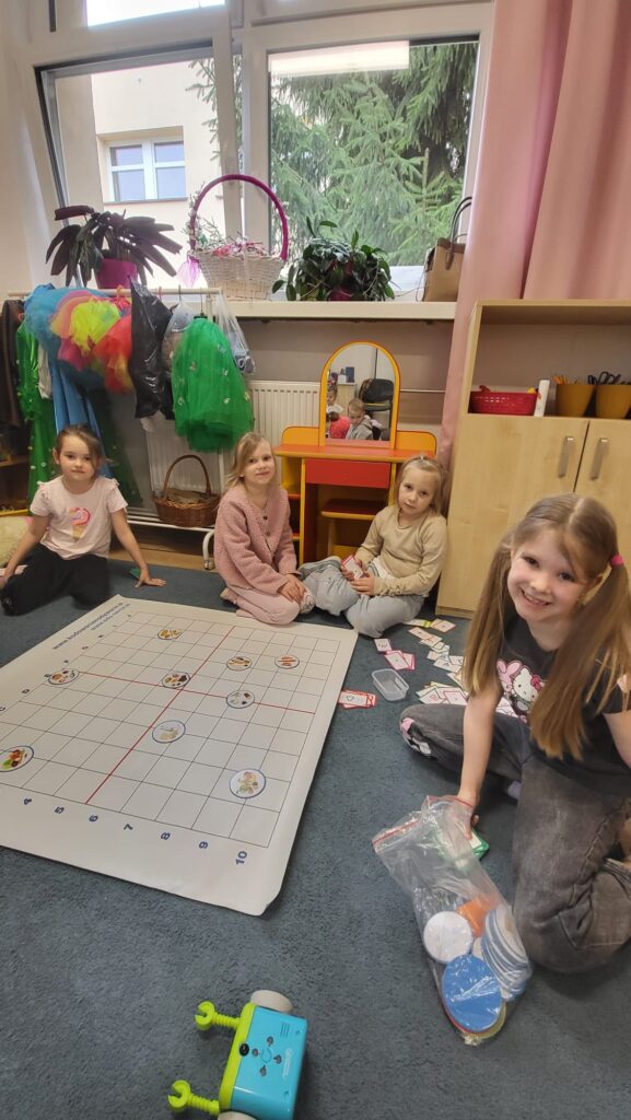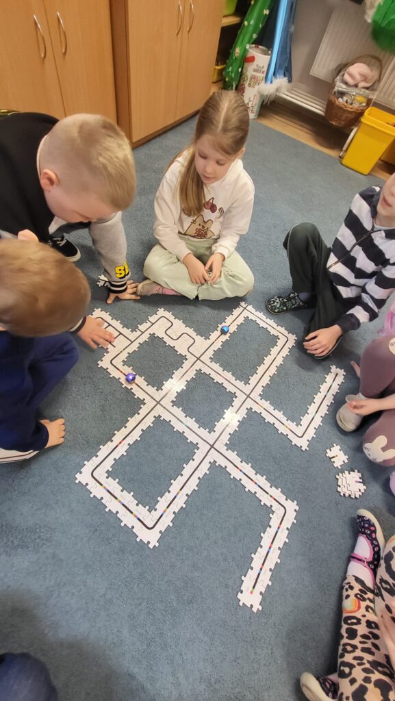 W naszym przedszkolu do zabawy i nauki z dziećmi wykorzystujemy narzędzia do kodowania offline takie jak: mata do kodowania, krążki, kolorowe kubki, kolorowe kartki, klocki, i inne, a także roboty edukacyjne Ozobot, Botley, GeniBot, myszka Jack. W praktyce Ozoboty – to miniaturowe roboty, które „czytają” kody narysowane mazakami. Dzieci rysują na kartce linie (trasy), a odpowiednie sekwencje kolorów (kody) sprawiają, że robot przyspiesza, obraca się lub zmienia kolor świateł. Myszka Jack i Botley to roboty programowane za pomocą pilota z przyciskami, umożliwiają planowanie dłuższej trasy, omijanie przeszkód lub przenoszenie przedmiotów. GeniBot to edukacyjny robot, pozwalający na naukę programowania za pomocą kart do kodowania. W trakcie zabaw z kodami dzieci uczą się logicznego myślenia, odczytywania symboli, orientacji w przestrzeni oraz koncentrują się na wyszukiwaniu rozwiązań. To nauka przez zabawę, która przyczynia się do rozwoju nowych umiejętności oraz przygotowuje do korzystanie z technologii w przyszłości.