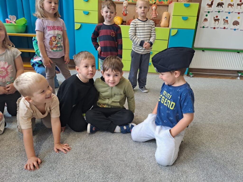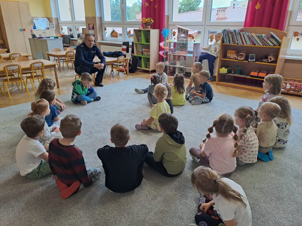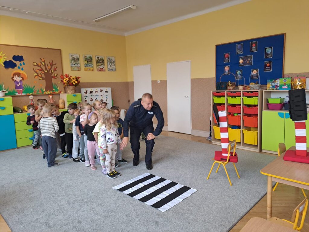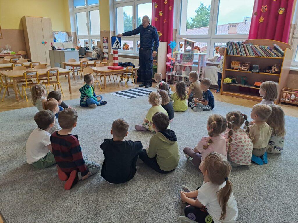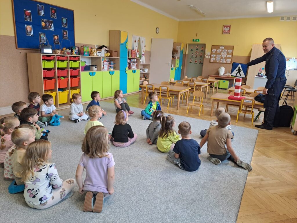 KRASNALE gościły w swojej sali pana policjanta. Utrwaliły zasady bezpiecznego poruszania się po drogach i dowiedziały się, że podczas podróży koniecznie muszą przebywać w foteliku z zapiętymi pasami bezpieczeństwa!